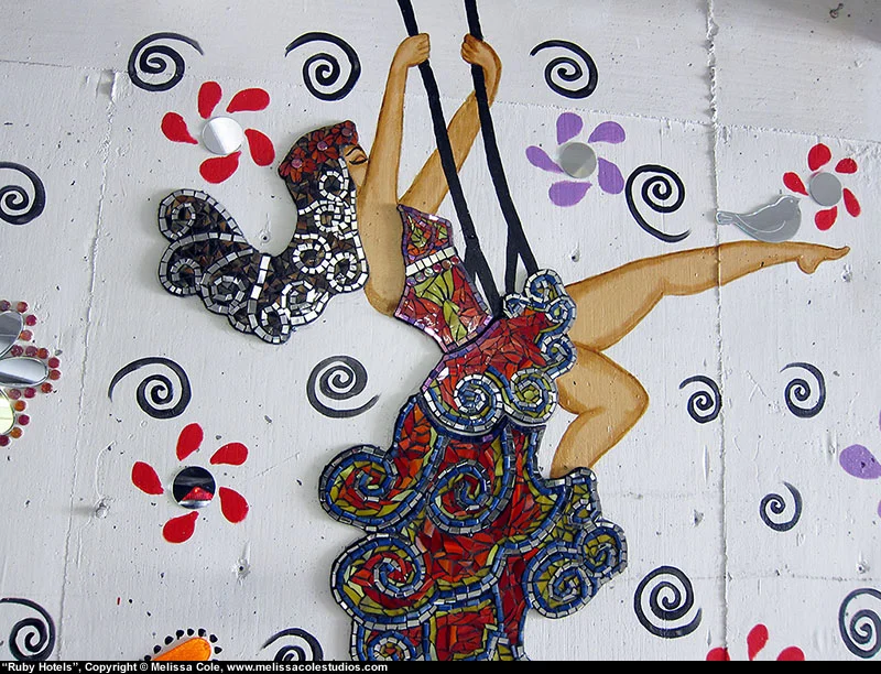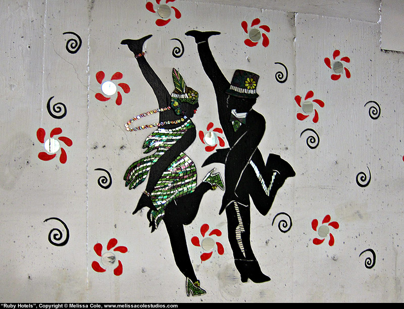 "Ruby Nights" was completed in 2014 using glass mosaic and epoxy grout on wedi board panels and exterior latex paint on the existing concrete wall. It is 400 feet long by 8 feet high. Located in the entryway of the Ruby 2 Hotel, this welcoming mosaic mural of dancers and performers highlights the entertainment district, where the hotel is located. The mosaic designs highlight the surrounding 1920s architecture to reflect this time period.